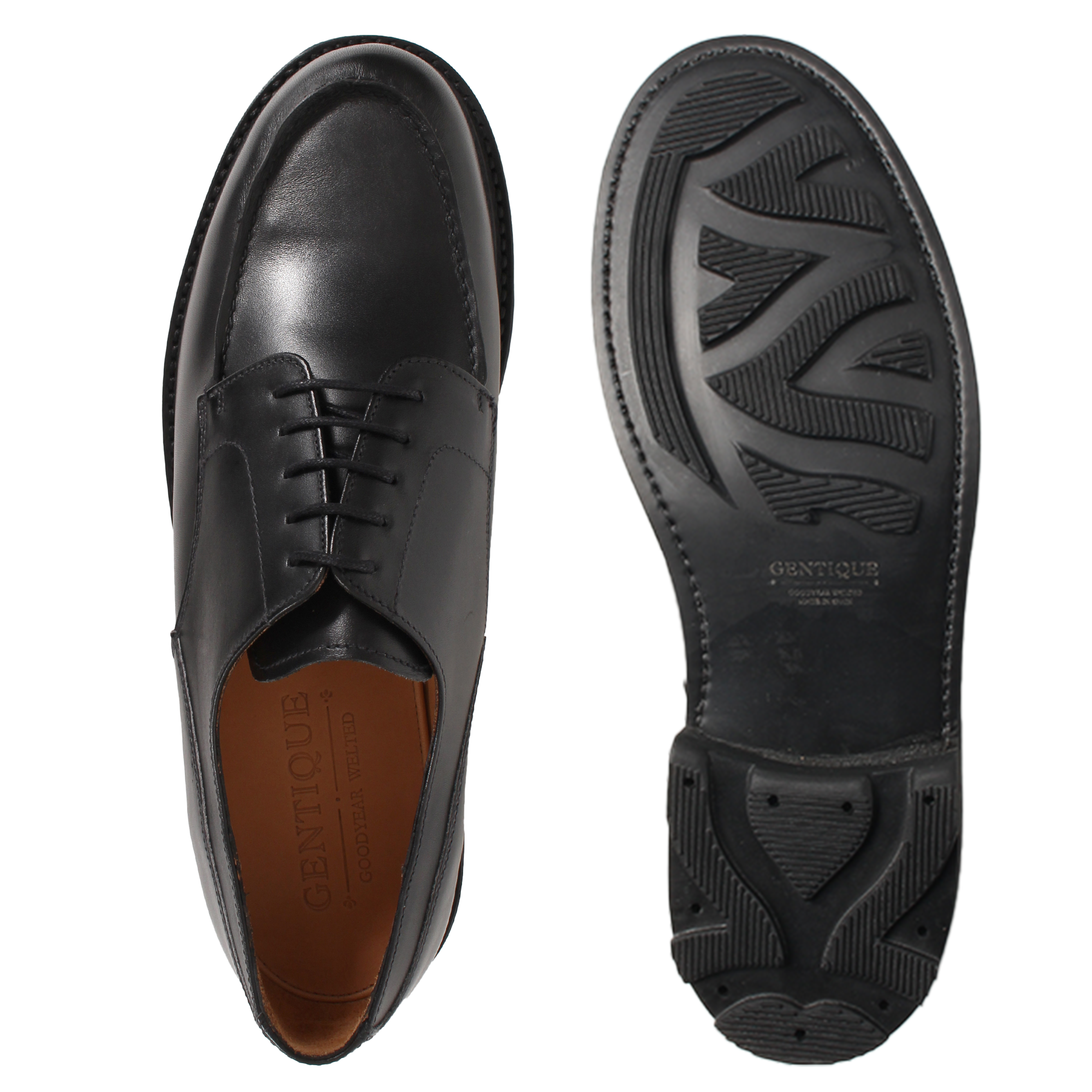 甲回りと踵の収まりがよく、履き始めはやや窮屈なサイズを選ぶのも一つ。 甲先には高さがあるため指先の圧迫感は少なく、余裕があるサイズを選択すると、のちにソックスやインソール等で調節をする必要になる場合もあります。オン・オフ両方で履きこなせるシルエットもこのデザインの特徴です。